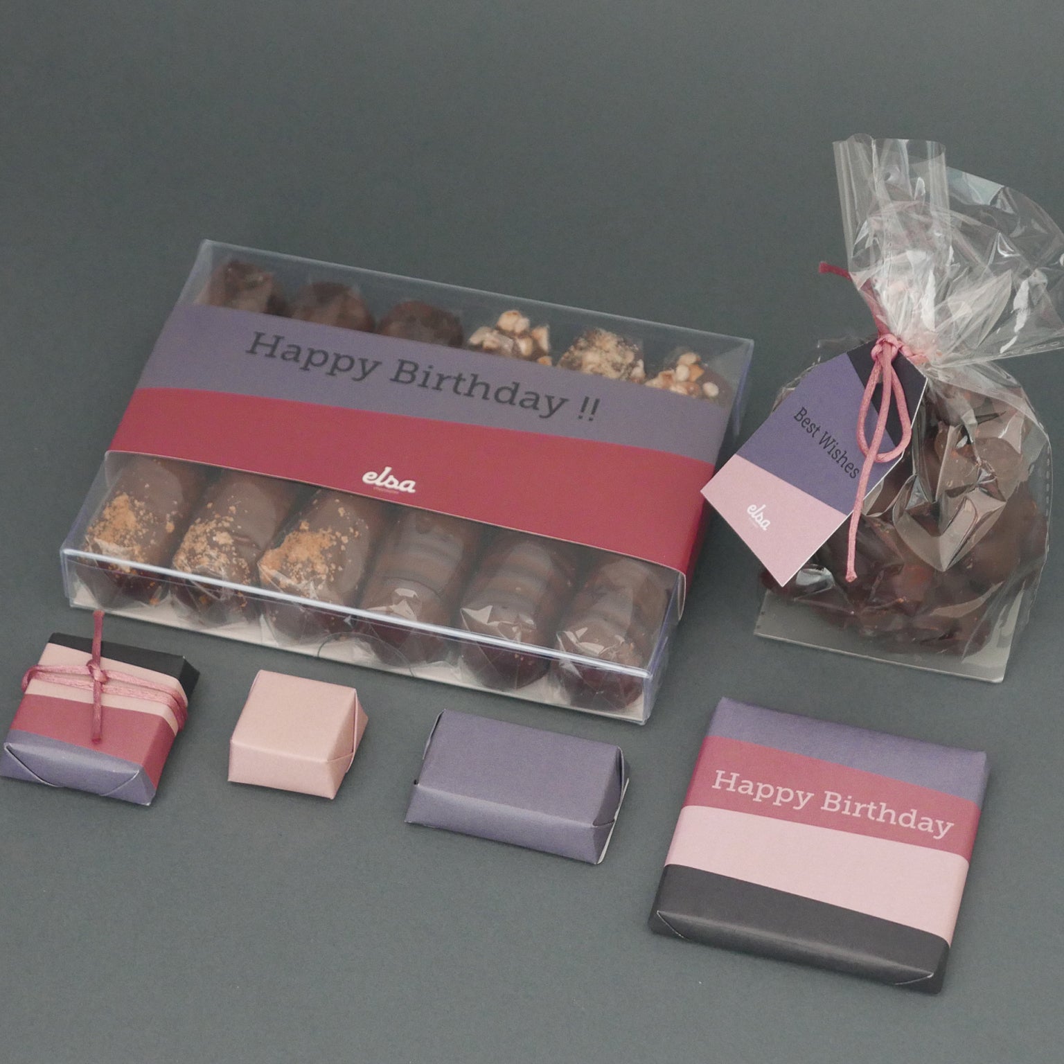 This hamper includes: Chocolate rolls box, chocolate clusters bag, chocolate pieces, and birthday cake topper.