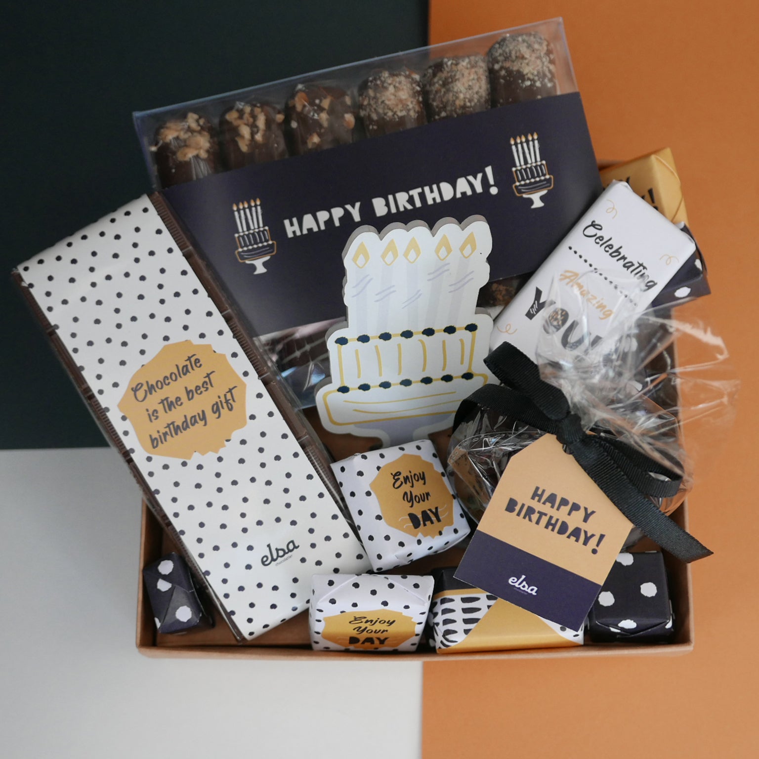 This hamper includes: Chocolate rolls box, clusters bag, chocolate pieces and birthday cake topper.