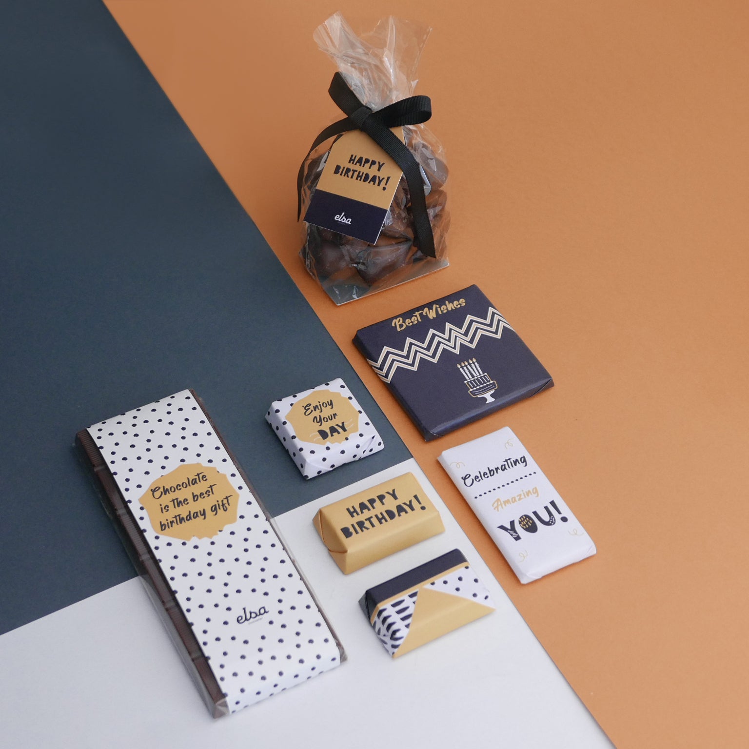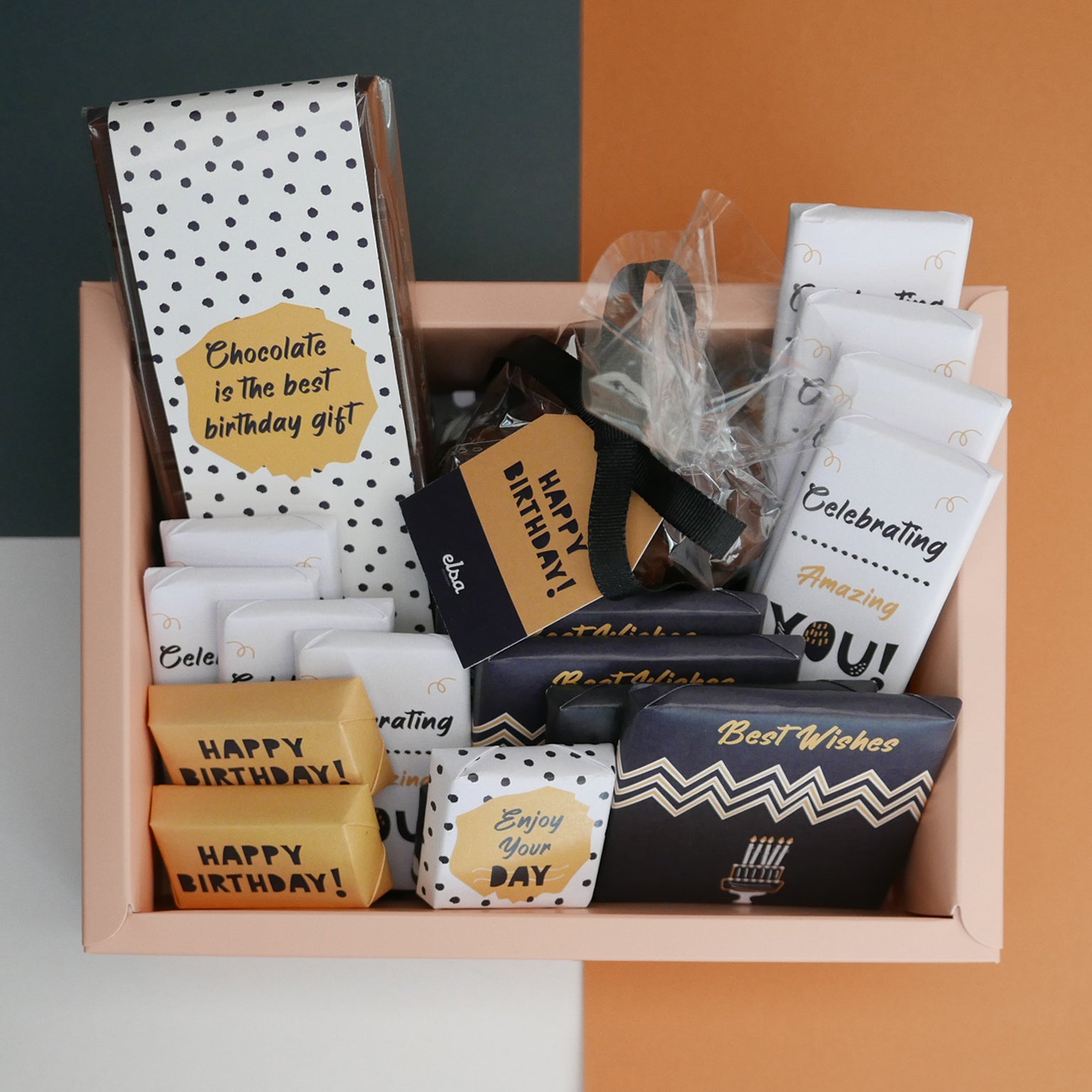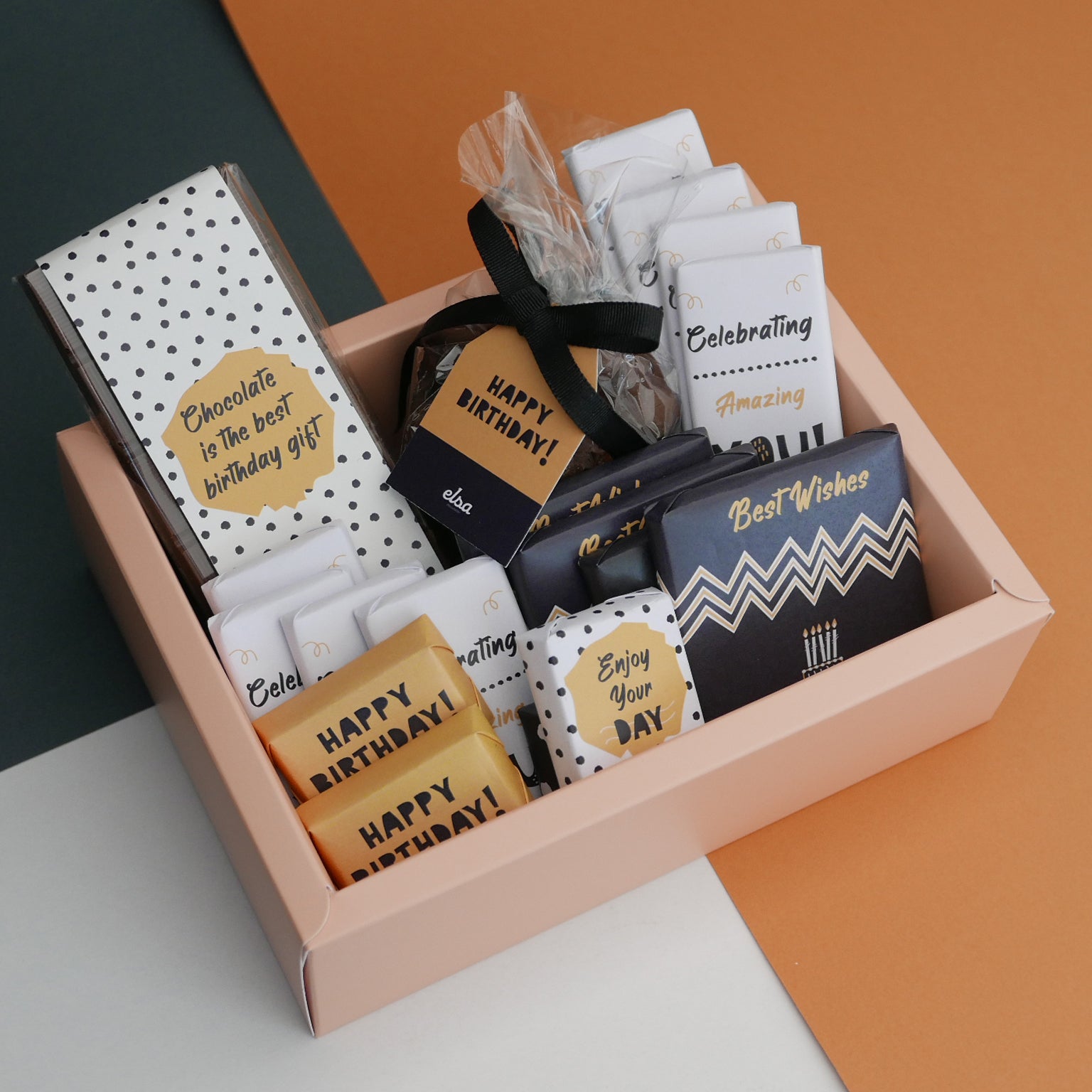 A beautiful and rich birthday chocolate hamper containing a chocolate tablet, clusters bag and chocolate pieces! Offer it to your friends and family and make their day!