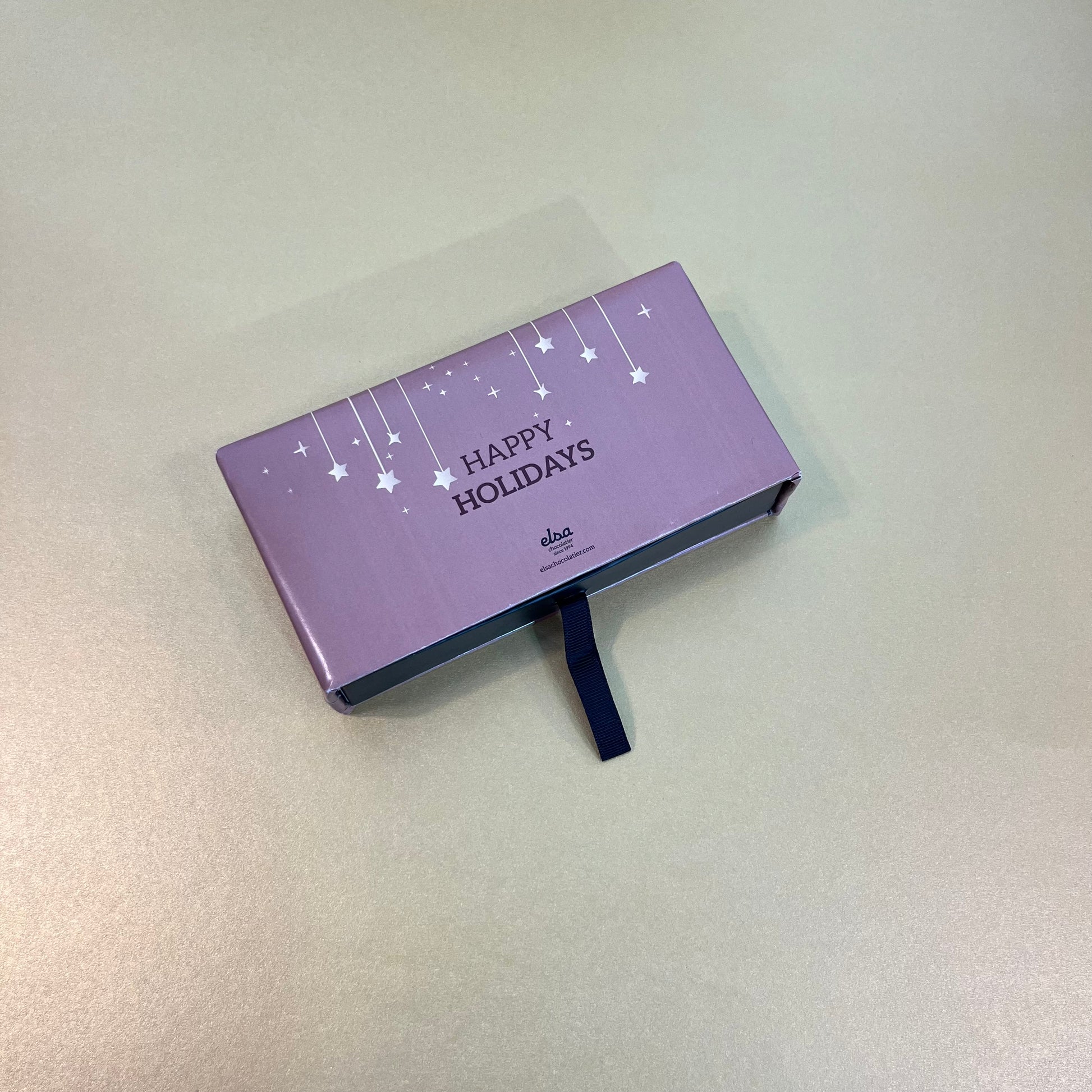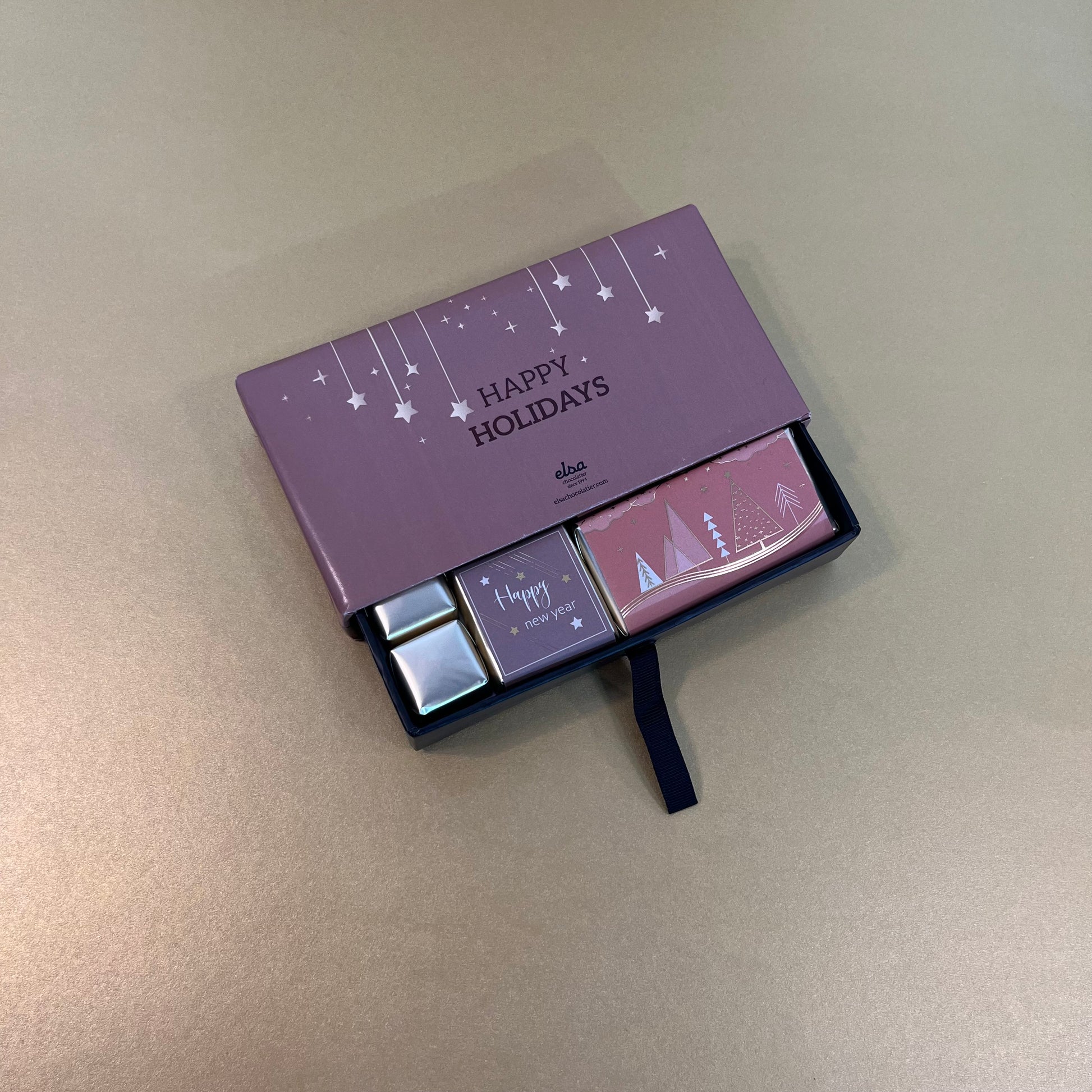 A captivating, holiday-inspired small box filled with delectable chocolates and gleaming wrappers, elegantly packaged in a sturdy drawer box. A luxurious gift for the end of the year.