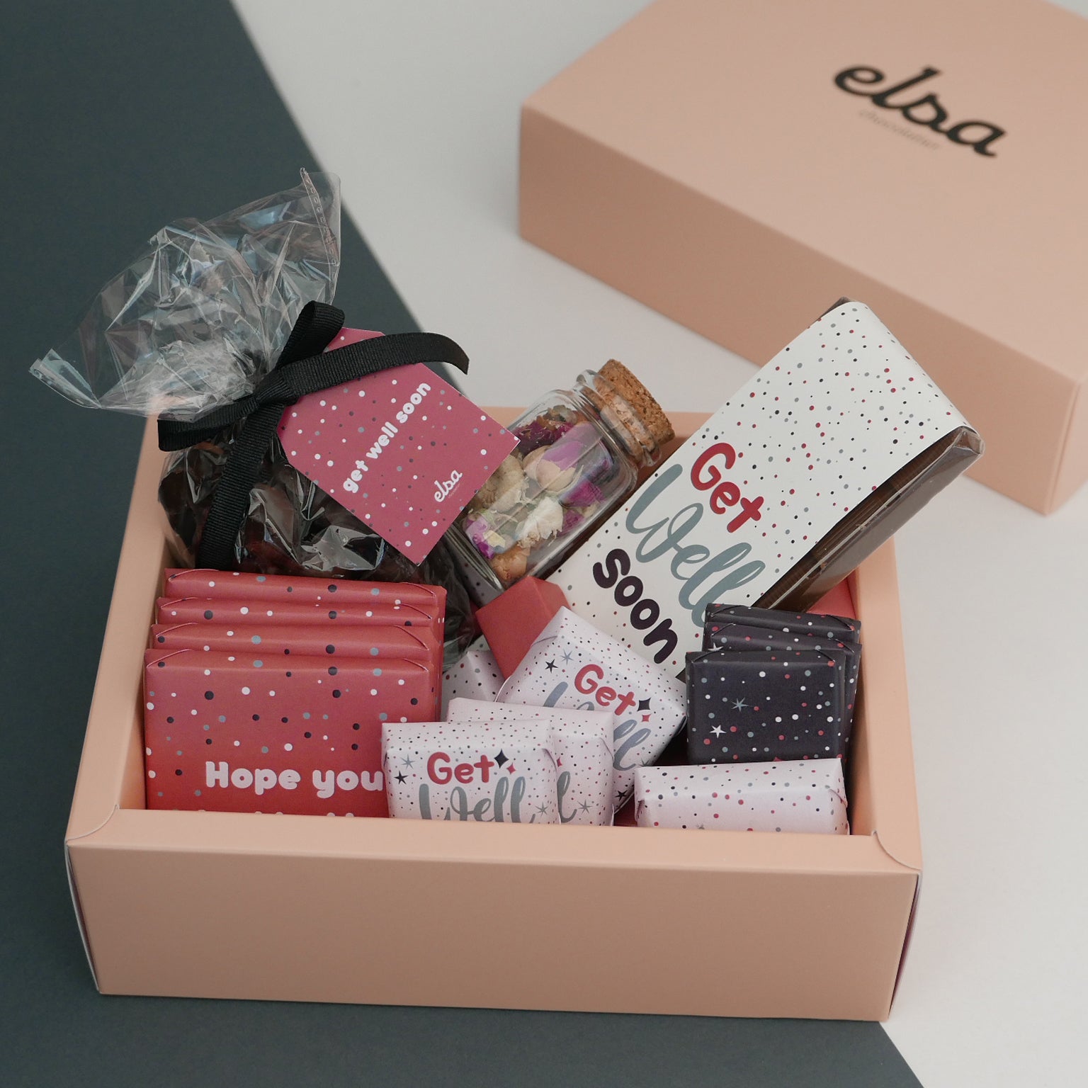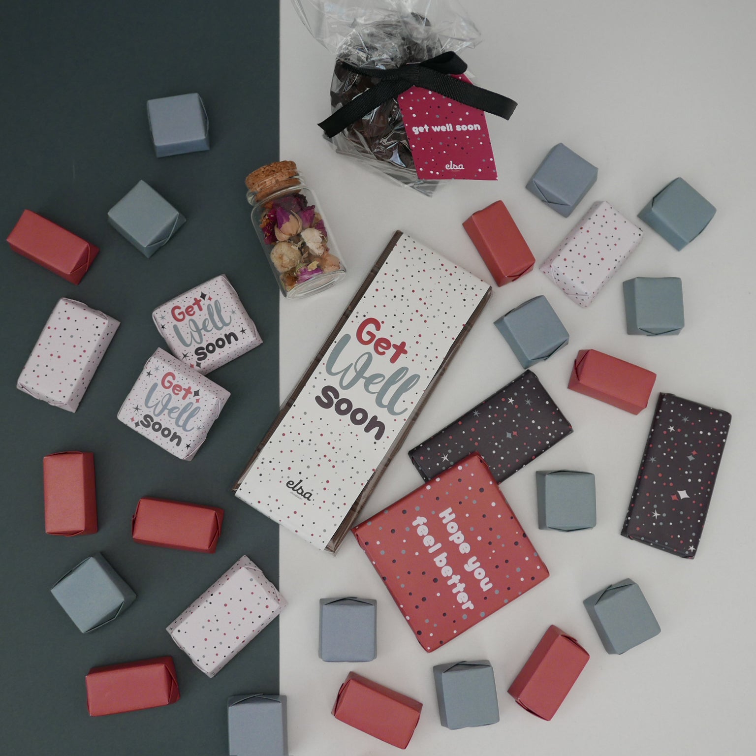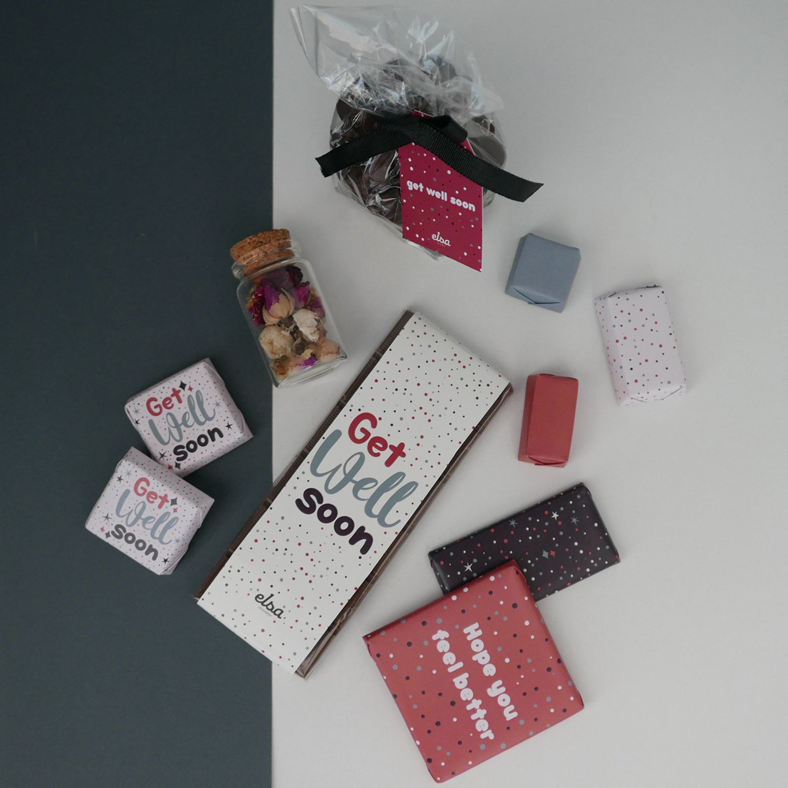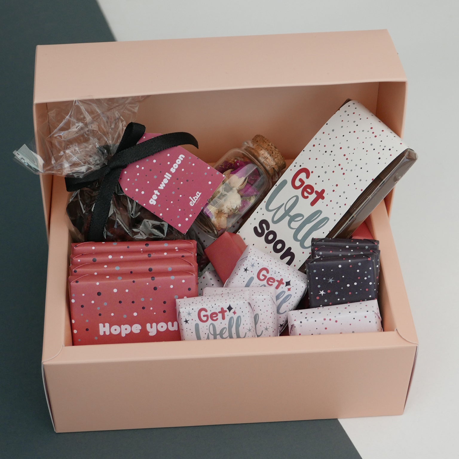 Thoughtful gift for someone who is feeling unwell. This chocolate hamper contains a chocolate clusters bag, chocolate tablet, chocolate pieces and a jar of infusion to make them feel better.
