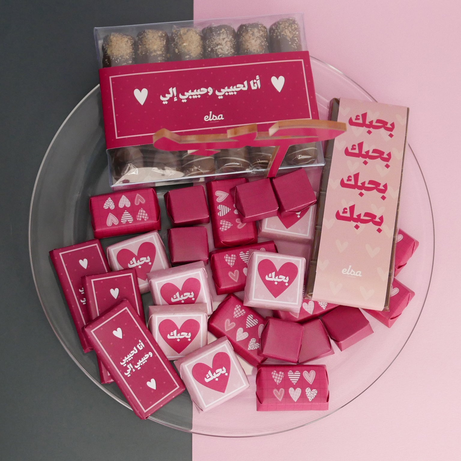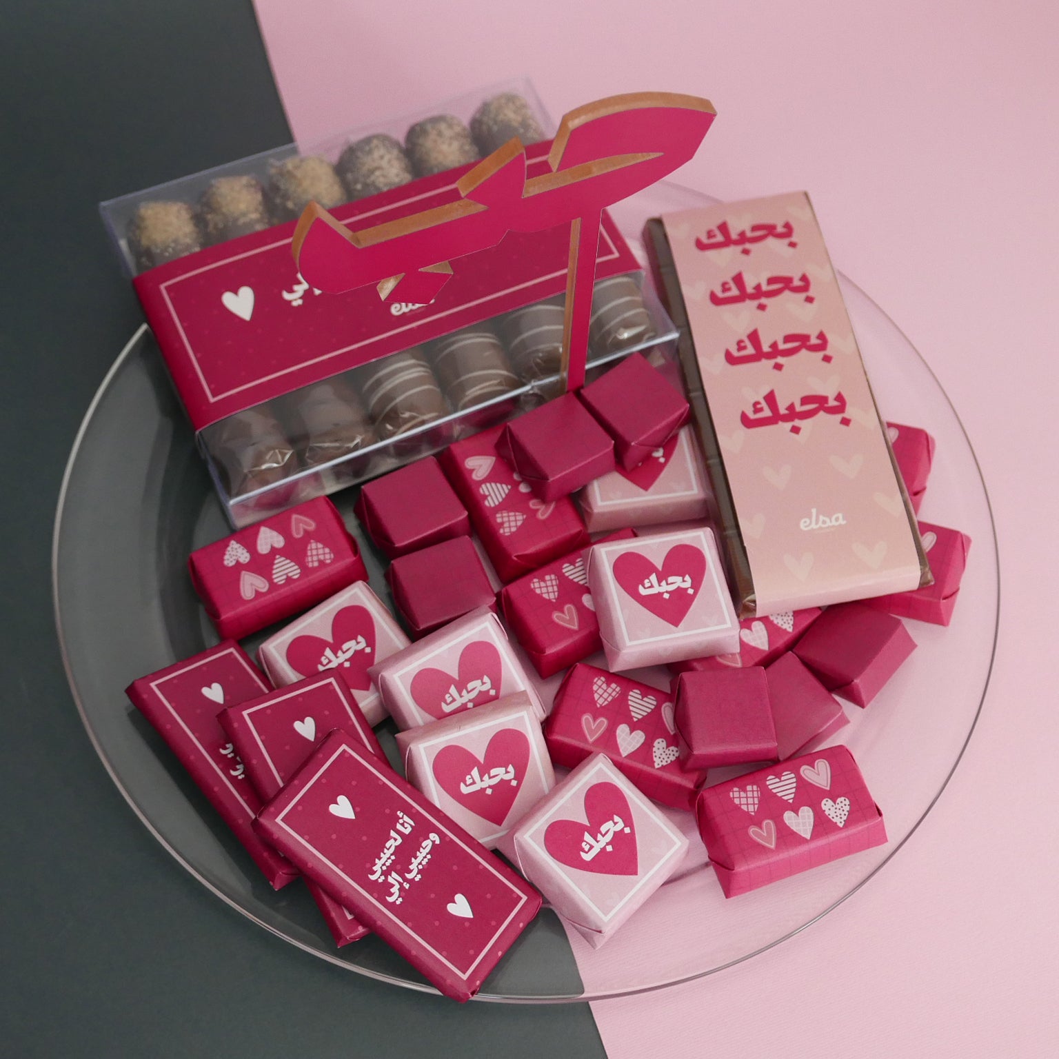 The glass plate contains a chocolate rolls box, chocolate tablet, and some delicious chocolate pieces!
