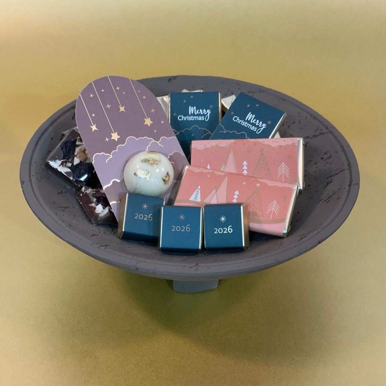 A delightful resin bowl brimming with festive chocolate treats, wrapped in cheerful holiday packaging. Perfect for spreading seasonal joy to chocolate lovers and making a stylish statement on any table. This trendy piece combines contemporary design with the warmth of indulgent gifting.