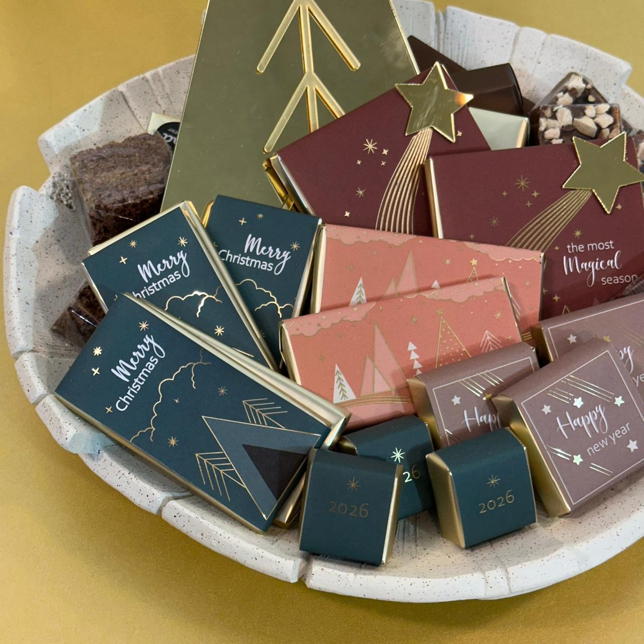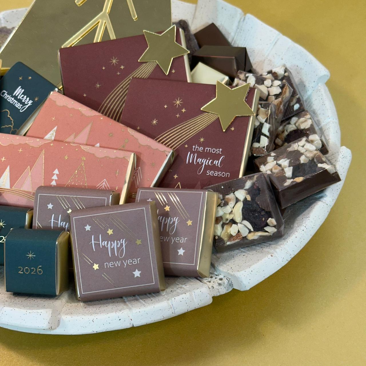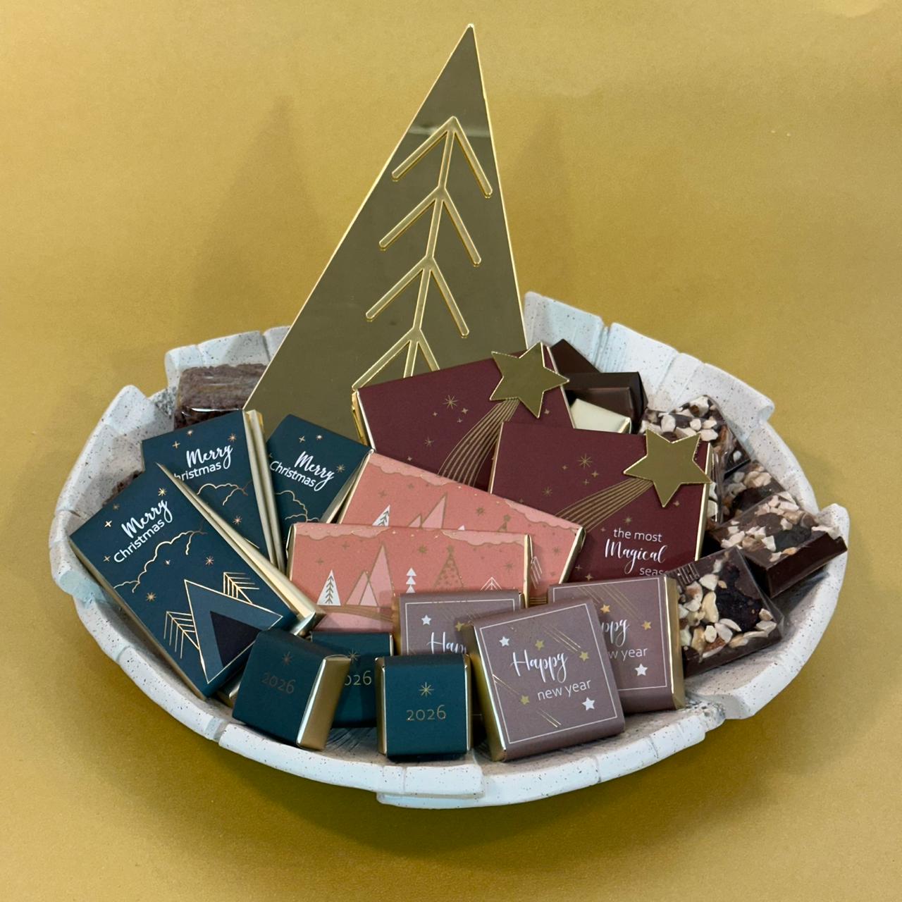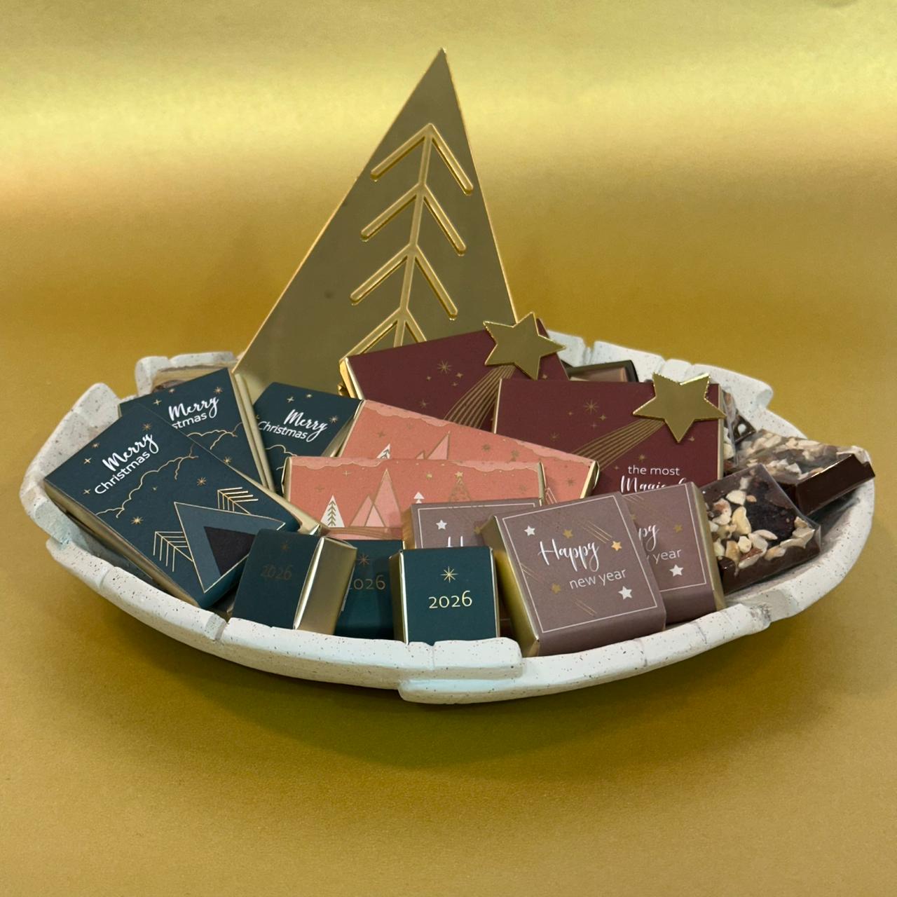 A refined resin plate brimming with luxurious chocolates exquisitely wrapped with shiny paper, ideal for those seeking an elegant holiday gift.