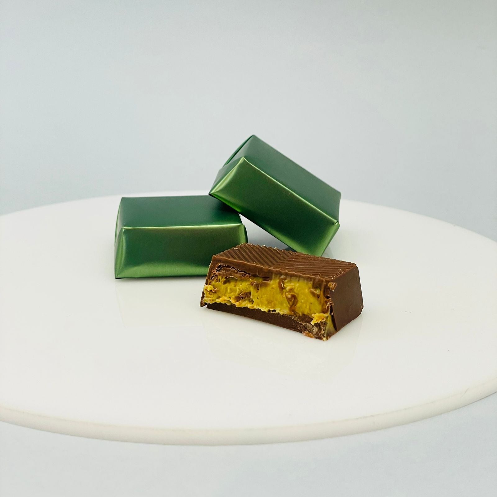 Indulge in the latest sensation that's taking the confectionery world by storm – the Trending Pistachio Knefeh Chocolate Bar. This delectable treat is a perfect harmony of rich, smooth pistachio cream and the delightful crunch of traditional knefeh, all enveloped in a luscious Belgian chocolate shell.